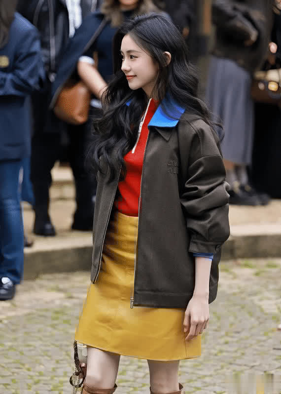 刘浩存的这套造型,除了棕色外套,红色内搭与黄色半裙的“西红柿炒蛋”配色,也只有她的颜值能驾驭。
