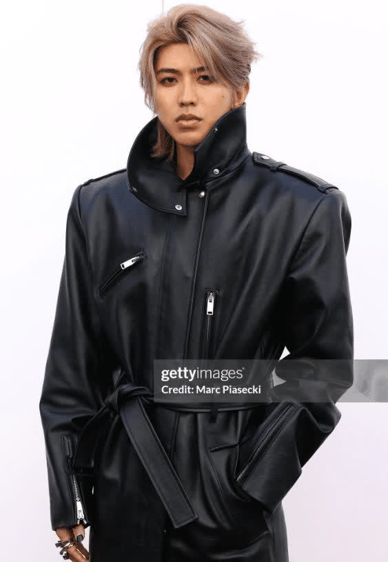 黑色皮质风衣,按道理来说是百搭且很少出错的款式,但这个突兀的垫肩将肩膀衬托的相当“伟岸”。