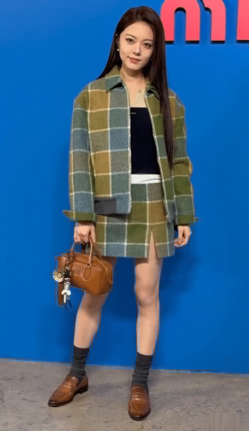 格纹毛呢外套搭配同花色短裙,学院风的造型有着邻家妹妹的亲切。