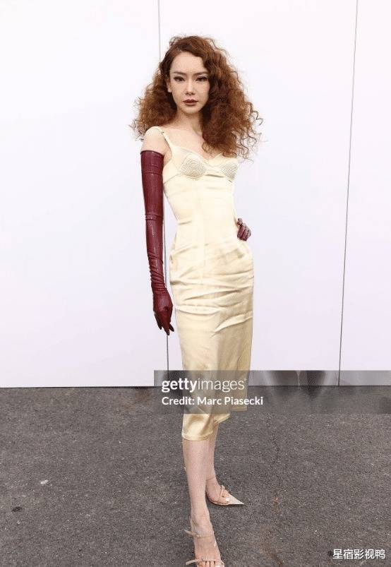 出奇蓬松的金黄卷发,米黄色的紧身长裙裹在消瘦的身材上,显得头重脚轻。